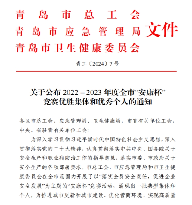 近日,青島市總工會、青島市應(yīng)急管理局、青島市衛(wèi)生健康委員會聯(lián)合公布了2022-2023年度全市“安康杯”競賽獲獎名單,中啟膠建集團(tuán)有限公司獲評青島市“安康杯”競賽優(yōu)勝單位,中德中小企業(yè)創(chuàng)新研發(fā)示范基地項(xiàng)目班組獲評青島市“安康杯”競賽優(yōu)勝班組。